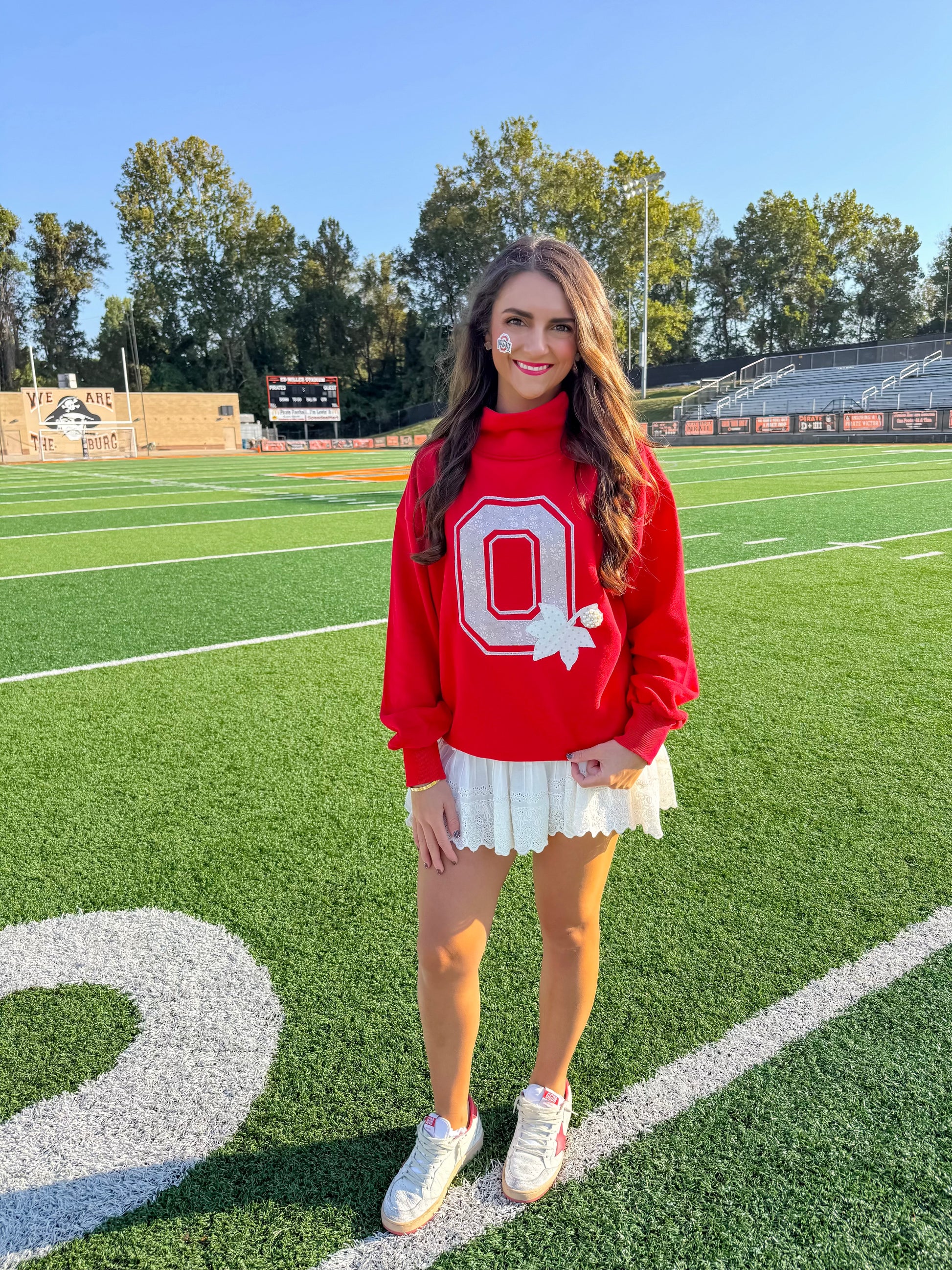 This red mock neck sweatshirt features a statement Block O in soft grey floral fabric, finished with a polka dot Buckeye leaf detail and pearl buckeye. I am wearing a size small for reference.