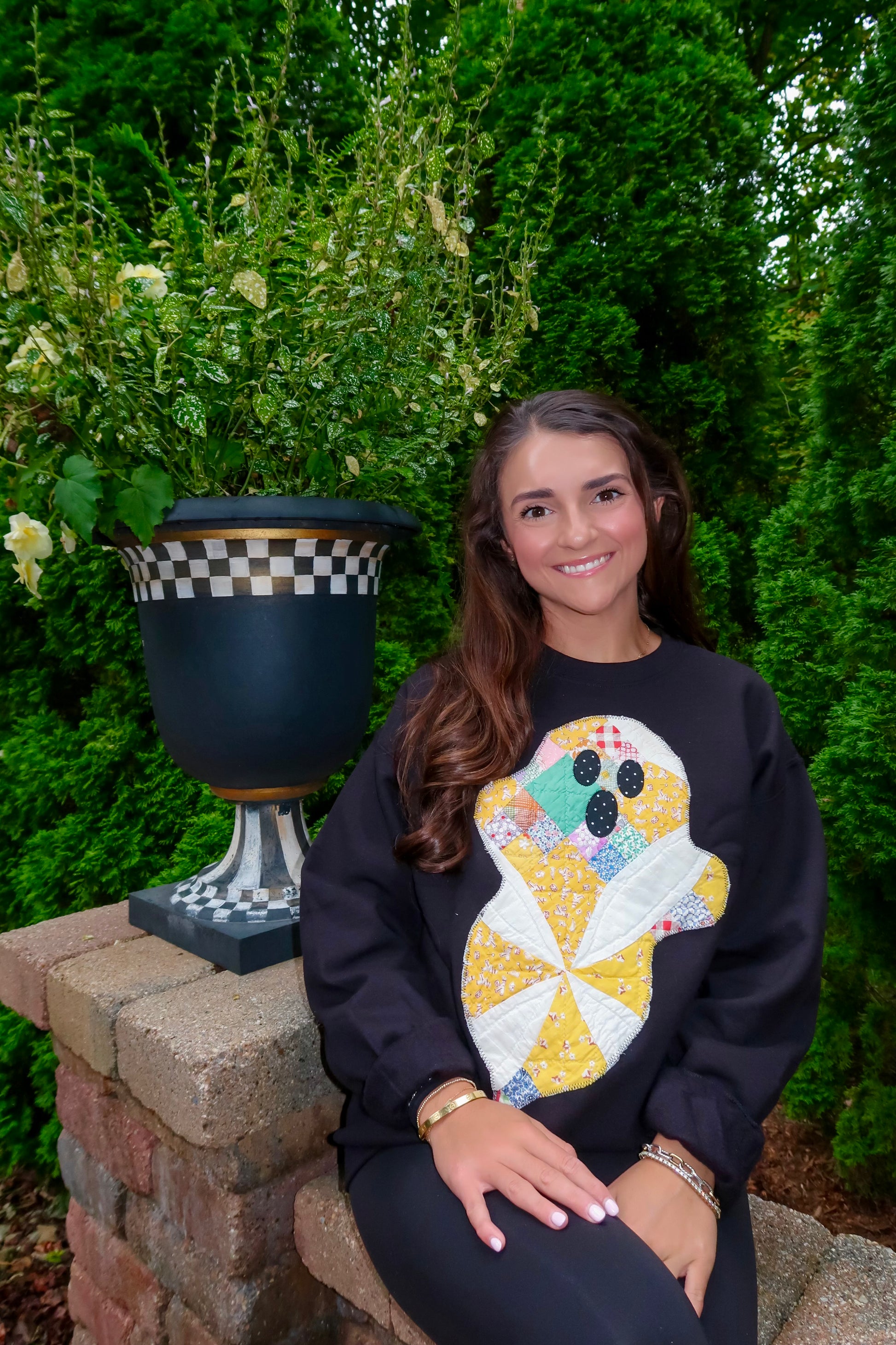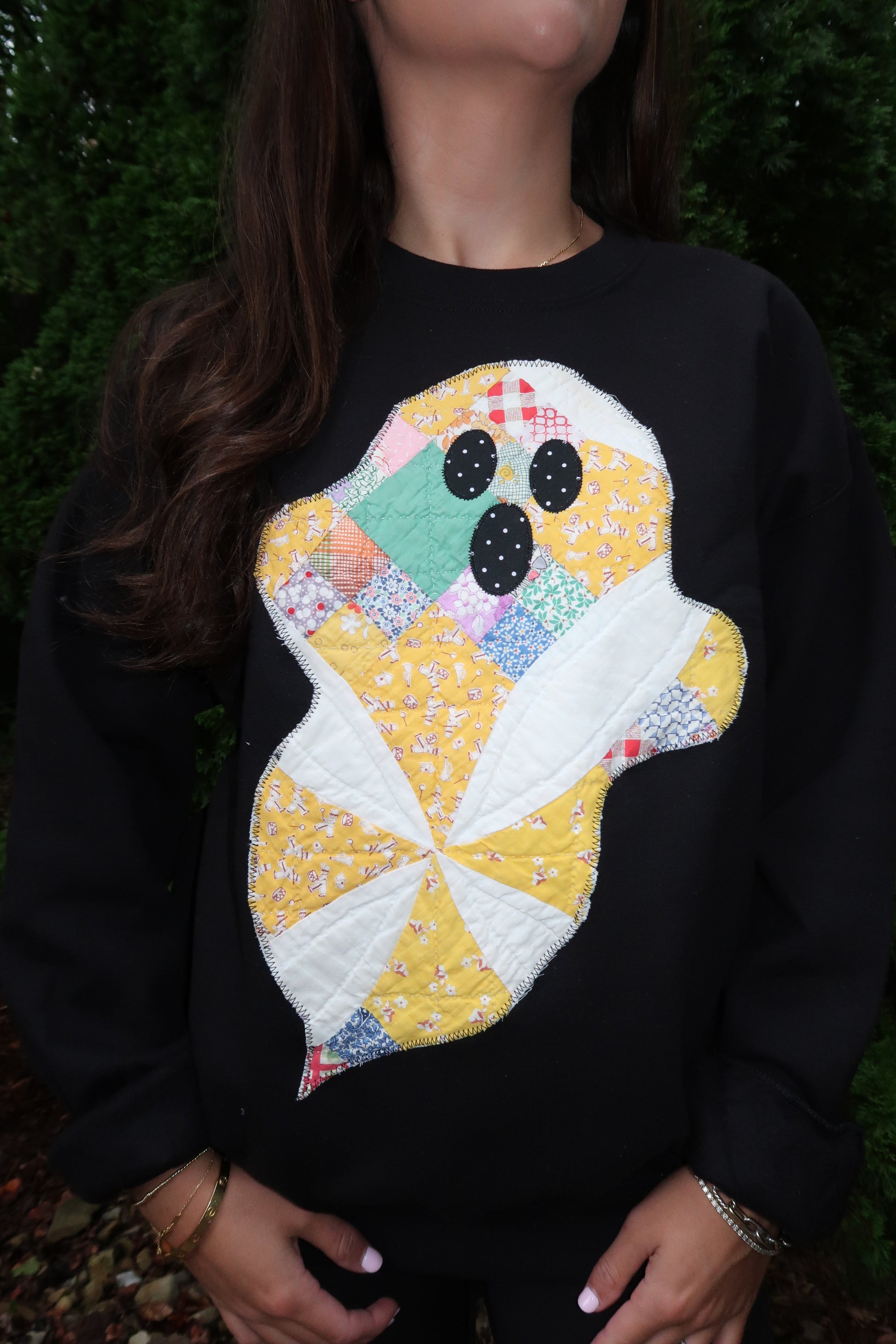 Our best-selling ghost is back and cuter than ever! Each spooky-sweet ghost is made using vintage quilt pieces, giving every crewneck a one-of-a-kind charm. All Sweatshirts fit true to size