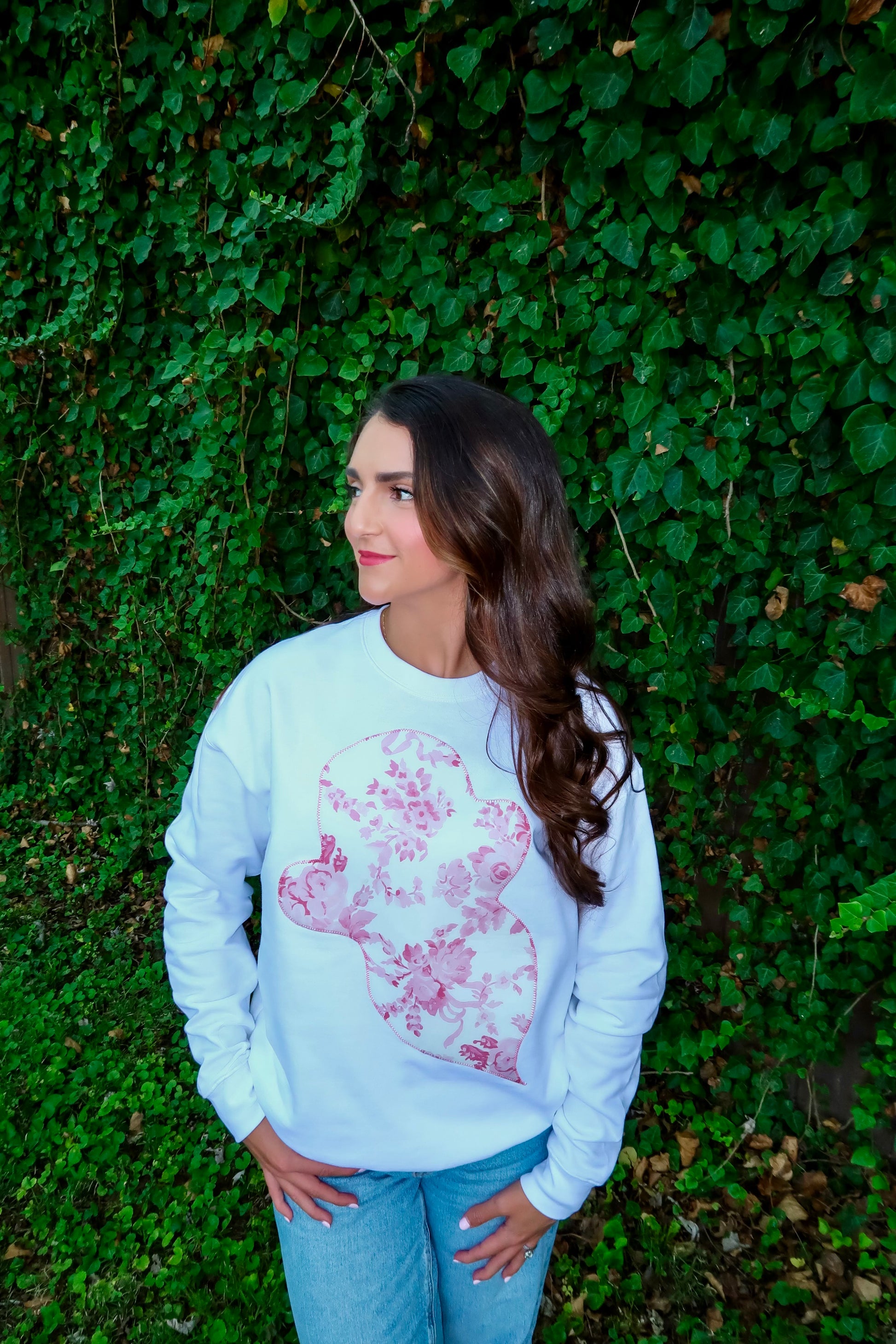 This cute Rosy Ghost is made out of LoveShackFancy fabric. The sweatshirt fits true to size.