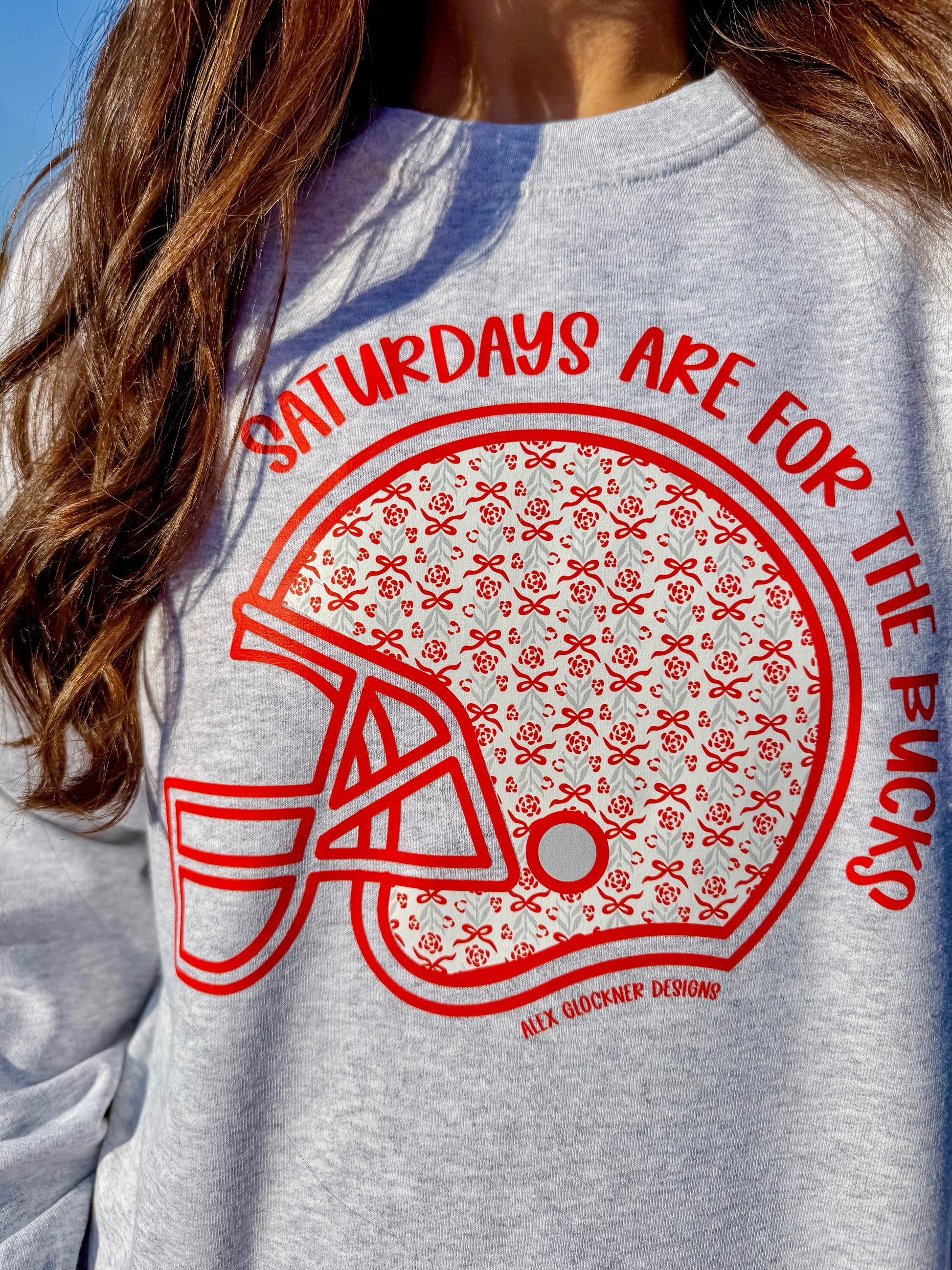 Saturdays are ALWAYS for the Bucks! This graphic crewneck is one of a kind featuring our classic AG print inside of the helmet. I am wearing a size small! These fit true to size.